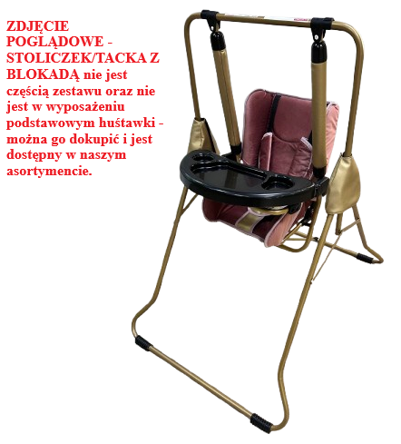 Uzupełnieniem mogą być: dopinany stoliczek z pałąkiem blokującym siedzisko, które ułatwią karmienie dziecka, a także daszek na stelażu.