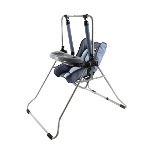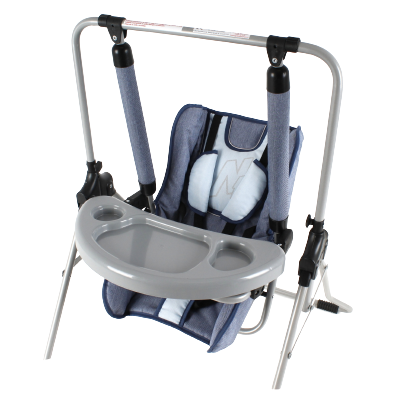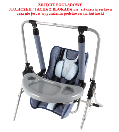 Dopinany stoliczek oraz blokada bujania. Dzięki STOLIKOWI - TACCE oraz blokadzie bujania huśtawka może służyć jako krzesełko do karmienia.