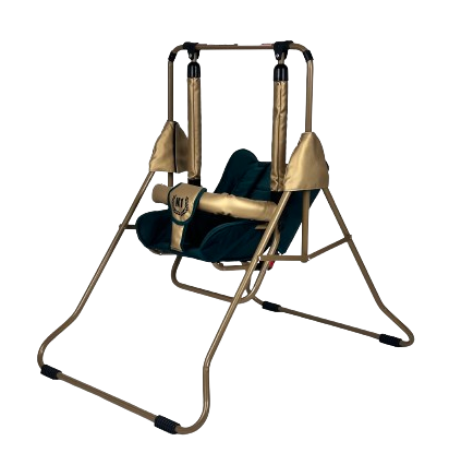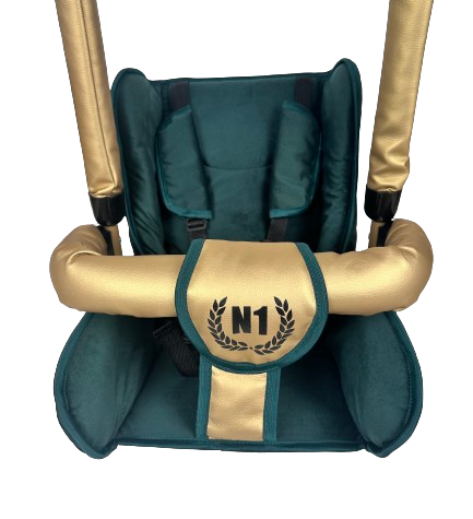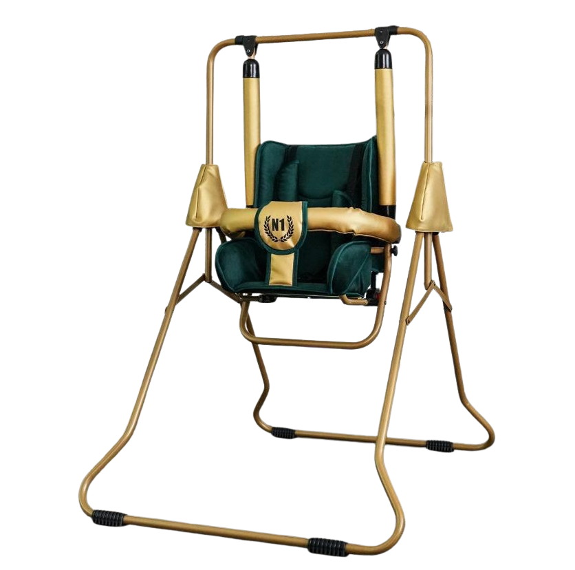 Huśtawka N1 GOLD wyposażona jest w barierkę, pięciopunktowe szelki zabezpieczające dziecko przed wypadnięciem, regulowane oparcie posiadające specjalne zabezpieczenie przed złożeniem oraz wysokiej jakości welurowy materiał oraz dodatkowe wypełnienie z gąbki, którym wyłożone jest całe siedzisko. Huśtawkę złożoną możesz śmiało postawić za drzwiami by nie zajmowała dużo miejsca.