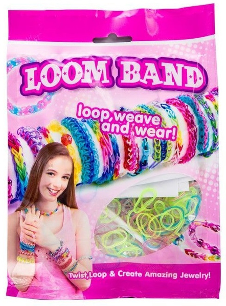 Zestaw różnokolorowych gumek wraz z szydełkiem do tworzenia opasek na rękę. Ćwicz wyobraźnię, projektuj i noś niepowtarzalne opaski z gumek.