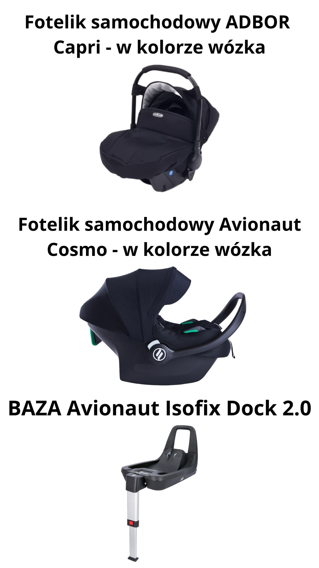 Fotelik samochodowy Avionaut Cosmo ISOFIX przystosowanego do bazy ISOFIX, który posiada specjalne adaptery umożliwiające montaż do konstrukcji wózka i przeznaczony jest dla dzieci o wadze do 13kg. Kolor fotelika będzie w tej samej kolorystyce co wózek i z tego samego materiału.