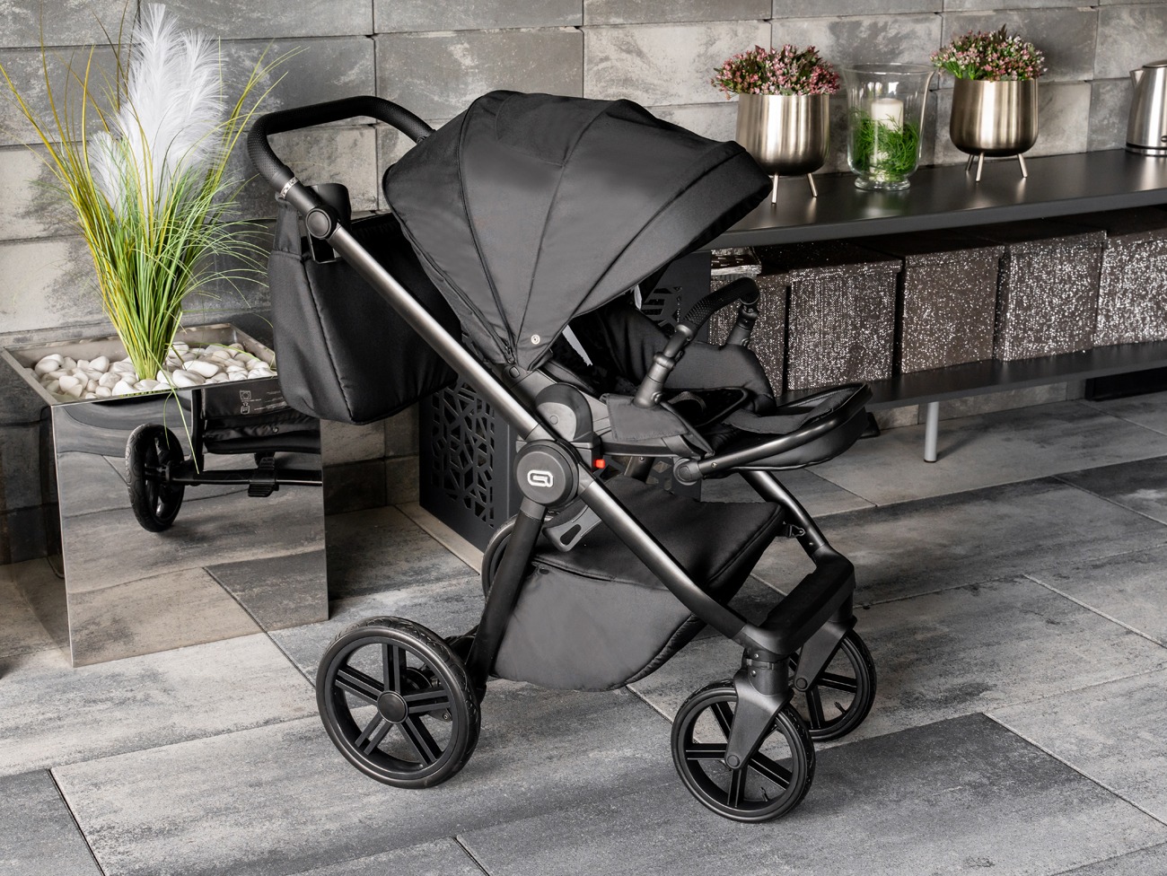 Montaż siedziska spacerówki, w opcji fotelika tyłem lub przodem do kierunku jazdy.